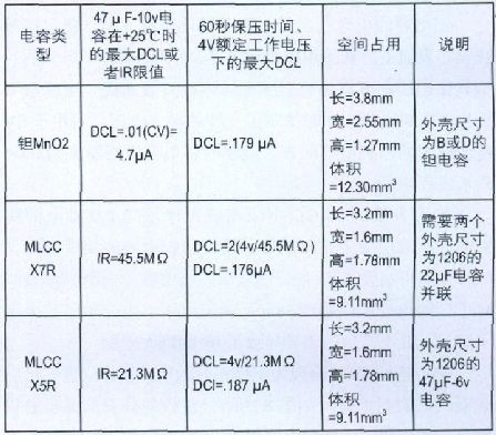 MLCC具有良好的低DCL特性,但在某些情況下,鉭電容能夠以更小的體積提供同樣低的DCL.表5 比較說明了根據DCL要求正確評估和選擇合適的電容的計算方法。如表5所示,鉭電容一般按照DCL最大值來確定規格。標準二氧化錳 (MnO2)構造的鉭電容在生產廠家處是按照 (。01xCV) 進行分級的。某些電容生產廠家還會隨DCL信息提供具體的保壓時間,并且根據比同級別的DCL最大值低得多的具體DCL限值進行電容器的預篩選。