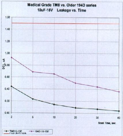生產廠家會對每種設計適用的鉭粉進行評估。隨電容器CV的增長,失效率隨之增長,因此應針對具體的設計選擇合適粒徑的鉭粉。對醫用級設計而已,其目的是在可用的外殼尺寸范圍內提供更為可靠的DCL性能。對商用級設計而言,其目的是通過以最小的可用外殼尺寸提供更高的-k CV鉭粉,從而盡量降低成本,最大化設計收益。因此商用鉭電容的DCL總體上會高于醫用鉭電容。
