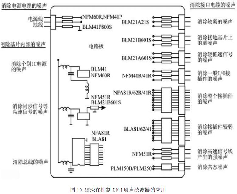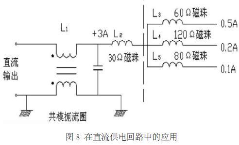 圖8、圖9、圖10 分別示出了磁珠在直流供電回路、數字電話、抑制 EMI 噪聲濾波器中的應用實例。