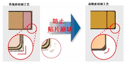 近年來,智能手機(jī)市場的需求迅猛增長,多功能化使手機(jī)產(chǎn)品的零部件數(shù)量增加,因此,可高密度安裝的超小型零部件的需求隨之增加。但是,以現(xiàn)有的制造技術(shù),切割工藝中的封裝尺寸公差較大,達(dá)±20μm,不僅如此,還存在貼片崩缺等各種課題,業(yè)內(nèi)認(rèn)為0402尺寸以下的開發(fā)是非常困難的。