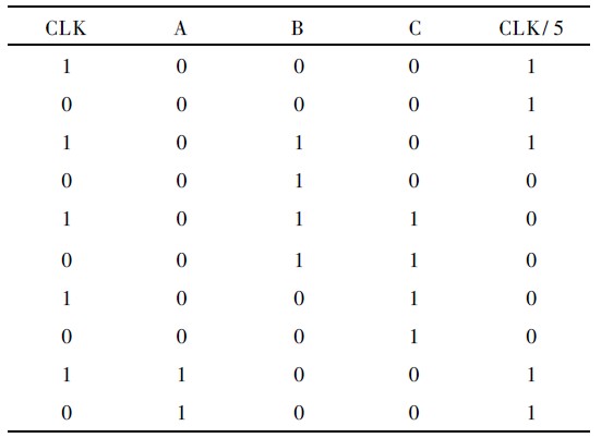 采用基于D 觸發器結構的五分頻器邏輯框圖如圖1所示。圖1 由3 個D 觸發器和少量邏輯門構成, 采用了同步工作模式, 其原理是由吞脈沖計數原理產生2 個占空比不同的五分頻信號A 和B, 然后對時鐘信號CLK, A 和B 進行邏輯運算得到占空比為50% 的五分頻信號CLK/ 5, 其計數過程如表1 所示, 從表1 的計數過程可知, 分頻后的時鐘CLK/ 5 的周期是輸入時鐘CLK 的5 倍, 由此實現了五分頻并且其占空比為50% .