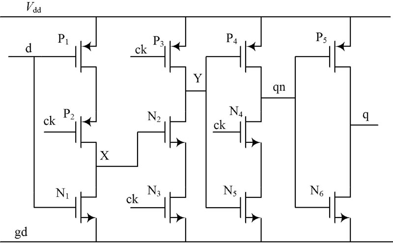 TSPC 電路構成的觸發器如圖3 所示, 由圖中可以看出, 該電路由四級反相器構成, 上升沿觸發, 當CK 為低電平, 輸入反相器在節點X 上采樣反向d 輸入,第2 級反相器處于保持狀態, 節點Y 預充電至V dd,第三級反相器處于保持狀態, 時鐘上升沿來時, 第二級反相器求值, Y 的電平值發生變化, 時鐘ck 為高電平時,節點Y 的值傳送到輸出q, 該觸發器的延時為4 個反相器的傳播延時, 由于電路中元件數目很少, 而且采用動態邏輯, 因此功耗極低。