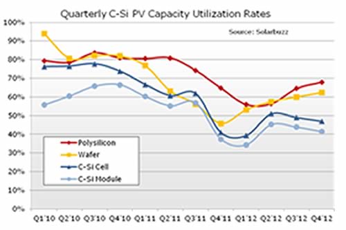 而對于一些第三季度還曾開足馬力生產的上游廠商來說,終端安裝量的激增并沒有全部轉化為新增訂單,出貨受阻導致三季度末庫存周轉天數不減反增,因此在第四季度堅決調低了產能利用率。晶硅電池和組件制造環節在第四季度的平均產能利用率僅為四成左右,預計在2012年一季度還將維持在這一水平附近,二季度開始則會出現回升。