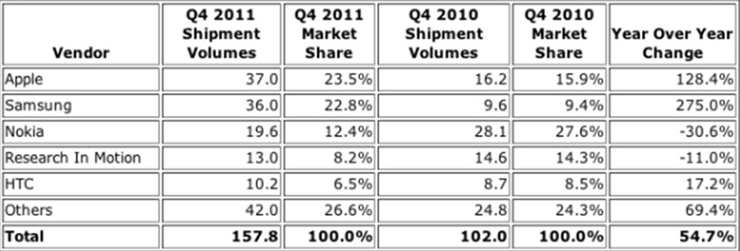 - 2011年第4季度全球智能手機銷量同比增長了54.7%