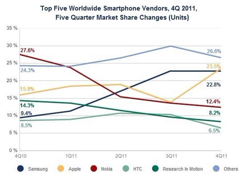 三星在第4季度完成了一系列重大的成就:首次突破了3000萬臺的銷量大關(guān),成為了各大智能手機企業(yè)同比增長最快的企業(yè),同時在2011年成為了智能手機整體市場的領(lǐng)頭羊。其Galaxy系列智能手機的市場份額進一步擴展,先后推出了針對高端市場的Galaxy S II和Galaxy Nexus,以及針對大眾市場的Galaxy Ace以及Galaxy Y等。同時該公司還在Windows Phone Mango的基礎(chǔ)上更新了其Omnia和Focus等產(chǎn)品。