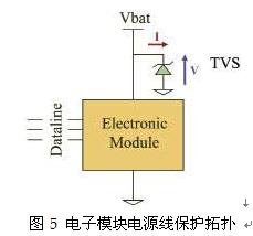 車載模塊的電源線保護是在汽車環境中需要關注的另一個問題,這個問題涉及ISO7637-2標準。例如,為滿足ISO7637-2標準,特別是圖1中的1、2、3a和3b的脈沖要求,只使用一個瞬變電壓抑制器(TVS)即可有效保護車載模塊。