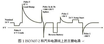 圖1簡要描述了ISO7637-2和汽車電源線上的主要電涌。