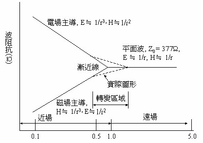 近場(near field)(磁和電的成份)和遠場的關系,如附圖一所示。所有的波都是磁場和電場成份的組合。這種組合稱作「Poynting向量」。實際上,是沒有一個單獨的電波或磁波存在的。我們之所以能夠測量到平面波,是因為對一個小天線而言,在距離來源端數(shù)個波長的地方,其波前(wavefront)看起來像平面一樣。