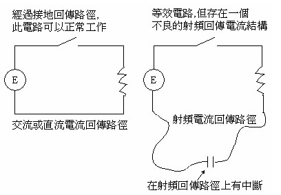 Maxwell方程式、Kirchhoff和Ampere定律全部都在說:若要使一個電路正常工作或依期望的目的工作,一個封閉回路型網(wǎng)絡必須要存在。附圖五表示了這樣的典型電路。當一條走線從來源端到達負載,一個回傳電流路徑也必須要存在,這是Kirchhoff和Ampere定律所規(guī)定的。