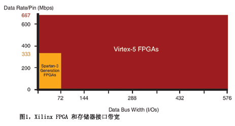帶寬是與每引腳數據速率和數據總線寬度相關的一個因素。Spartan-3 系列和 Virtex-5 FPGA 均提供了不同選項,從數據總線寬度小于 72 位的較小的低成本系統,到寬度達 576 位的較大的 Virtex-5 封裝(圖 1)。
