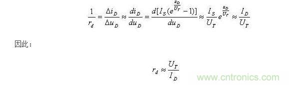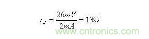 ID為靜態(tài)電流,常溫下UT=26mV。可知,靜態(tài)電流ID越大,rd將越小。設UD=0.7V時,ID=2mA。由此可得直流電阻RD=350,而動態(tài)電阻(交流電阻)為: