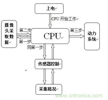 說明:上電之后,CPU開始工作。首先,CPU開始控制攝像頭和傳感器同時(shí)工作,同時(shí)采集信息,把采集回來的信息進(jìn)行分析,在CPU內(nèi)部進(jìn)行A/D或D/A轉(zhuǎn)換,然后將轉(zhuǎn)換后的信息傳遞給舵機(jī),使舵機(jī)在CPU的控制下進(jìn)行工作。