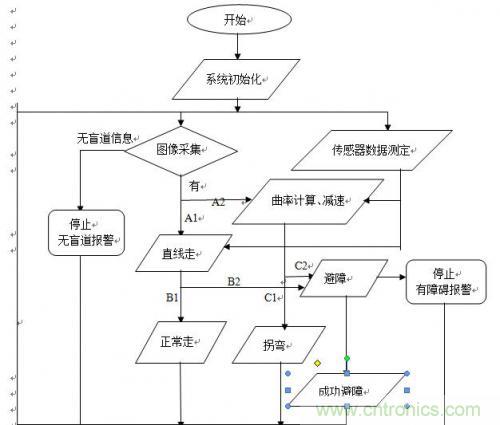 通過CMOS攝像頭采集路況信息,經(jīng)CPU處理判斷前方是否有障礙物。若無,則車?yán)^續(xù)引導(dǎo)人前行;若有障礙物,則車發(fā)聲報(bào)警。通過超聲波傳感器檢測,如果可以越過則繼續(xù)前進(jìn),如果無法越過,就停止。如果需要轉(zhuǎn)彎,則減速轉(zhuǎn)彎。同時(shí)導(dǎo)盲車上還有GPS導(dǎo)航系統(tǒng),可以確切知道盲人所處位置。