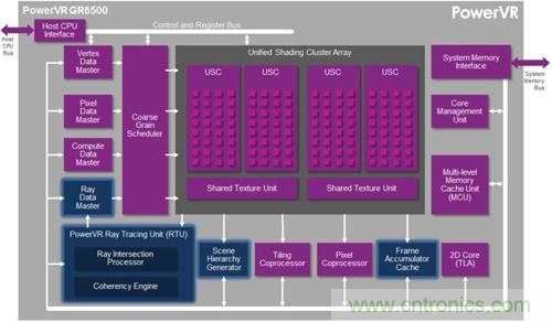新家族的第一名成員是PowerVR GR6500,基于最新一代的四陣列移動GPU PowerVR Rogue設計而來,整合了PowerVR Series6 XT系列的所有特性,并加入了強大的光線追蹤硬件加速電路。