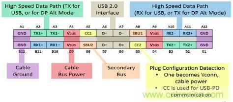 圖1:USB Type-C的接口功能定義,從結構上實現了無方向正反插