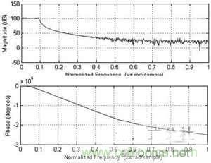 根據(jù)上面的程序,取調(diào)頻斜率為400,頻率控制字為10,幅度量化為10位(和所使用的D/A配合),相位累加器為24位,用Matlab仿真得到的線性調(diào)頻信號(hào)的波形和相應(yīng)的幅頻響應(yīng)如圖3和圖4所示。