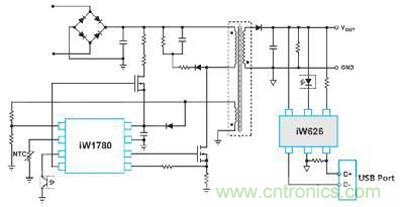 典型的手機充電器的硬件結構(以基于Dialog方案的高通QC2.0快充協議為例)如圖 1所示。iW626作為QC2.0協議控制器,經由USB口的D+/D-信號和手機側AP進行供電協商,然后通過光耦控制原邊的AC/DC控制器iW1780完成輸出電壓的調整。