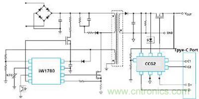 基于PD協議的充電器電路可以維持AC/DC部分不變,只是將QC協議控制器替換為PD控制器[1],比如Cypress半導體的CCG2(Type-C Controller Generation 2). CCG2 是最早通過USB-IF認證的PD控制器之一,內部包含ARM® Cortex®-M0處理器和完備的PD協議收發器,可以滿足充電器,主機,附件,EMAC線纜等各種支持Type-C口的應用,在蘋果,聯想,HP,Dell,小米,樂視等一線品牌客戶都有眾多的量產案例。