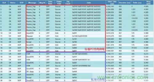 為了更加有效開發和準確驗證基于控制流程的協議溝通,本文采用賽普拉斯研發的PD協議分析儀CY4500 EZ-PD™ Protocol Analyzer。CY4500 協議分析儀通過抓取配置通道(CC,Configuration Channel)上的數據包,并通過USB接口發送到主機端,通過軟件EZ-PD Analyzer Utility解碼并顯示PD協議包。CY4500不僅可以實時顯示并解析PD通信包,而且還實時測量電力傳輸過程中的電壓和電流值,進而縮短了開發周期,對于調試以及兼容性測試幫助非常大。