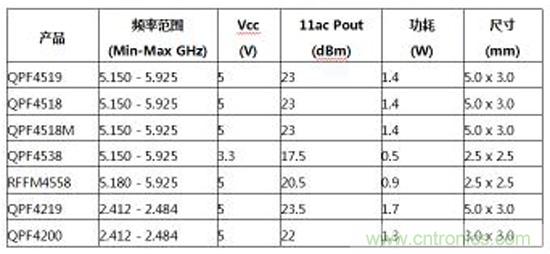 新的Qorvo FEM支持最新一代802.11ac和Wave 2 1024QAM家居Wi-Fi產品,功耗比現今市面同類產品低2瓦特。這足以使一些Wi-Fi聯網設備的風扇變得不必要,進一步降低功耗,減小尺寸。5 GHz FEM現在提供樣片;2.4 GHz型號將在2017年一季度推出。下表總結了新Qorvo Wi-Fi FEM系列的規格。