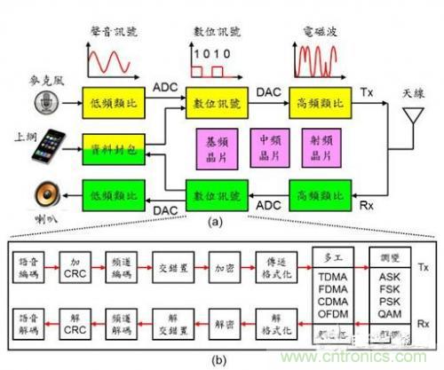 數字通信系統的架構如圖二(a)所示,使用者可能使用智能型手機打電話進行語音通信或上網進行數據通信,我們分別說明如下:
