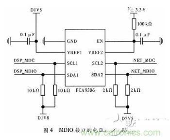 因為88E1111上集成的MDIO與C6678集成MDIO模塊進行連接時,電壓有所差別,前者電壓為2.5 V,后者電壓為1.8 V,所以在二者之間應該添加電壓轉換器。本文采用一片PCA9306,實現2.5 V和1.8 V之間的電平轉換,其連接電路如圖4所示。