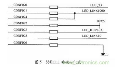 88E1111與C6678的MDIO模塊相連接,MDIO最多可識別32個物理芯片,在使用物理芯片之前需要對其進行配置,配置內容主要包括芯片的地址、模式等。配置CONFTG[6:0]管腳定義可查詢文獻,本文配置的硬件電路如圖5所示,圖5中可以不使用電阻,本文為了測試方便,加一個0 Ω的電阻。