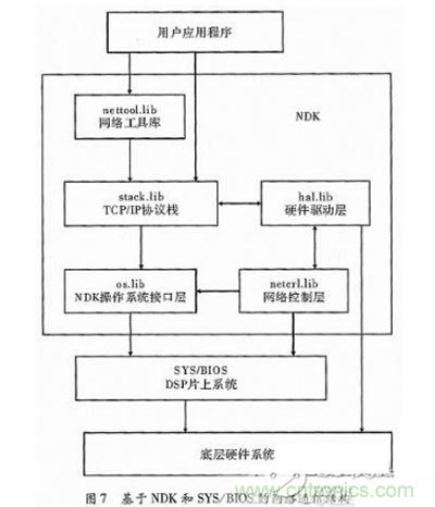 NDK的基本結構如圖7所示,可看出NDK開發套件與用戶程序、SYS/BIOS操作系統和底層硬件都有密切的聯系。NDK中網絡控制層和操作系統接口層與SYS/BIOS系統相連接,NDK的硬件驅動層用于控制底層硬件驅動的配置,這些操作和配置均可在網絡工具庫中找到相應的驅動函數,并可直接由用戶應用程序來調用實現。