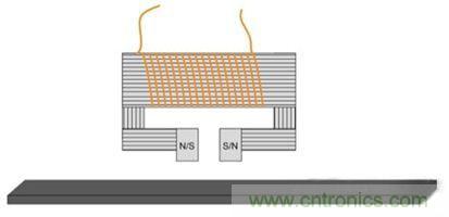 在實(shí)用化系統(tǒng)中需要用到一個(gè)寫入磁頭,它其實(shí)就是繞在磁心上的一個(gè)線圈。通過控制線圈中的電流方向可以很容易編程磁場(chǎng)方向。這有助于在磁卡上形成南北極圖案。磁極之間的空隙越窄,磁卡上能夠編程的數(shù)據(jù)密度就越高。