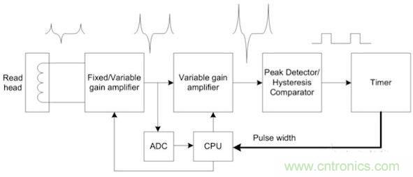 CPU讀取ADC,然后控制放大器增益。放大后的信號(hào)送到磁滯比較器產(chǎn)生邊沿接近信號(hào)峰值的數(shù)字信號(hào)。CPU隨后必須調(diào)整放大器增益,使其閾值接近峰值但不超過峰值。這有助于避免磁卡發(fā)生抖動(dòng)時(shí)出現(xiàn)定時(shí)誤差。磁滯比較器輸出則送到定時(shí)器進(jìn)行脈沖寬度測(cè)量。CPU讀取定時(shí)器輸出,并解碼為邏輯1或0的數(shù)據(jù)。當(dāng)劃卡結(jié)束時(shí),CPU打包數(shù)據(jù)比特,檢查是否有錯(cuò)誤,然后通過I2C、SPI或UART接口將數(shù)據(jù)送給主機(jī)。