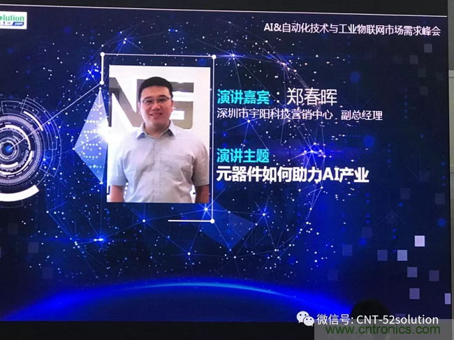 為積極推動跨行業的電子開發需求與方案服務商的對接,大力發展技術外包服務,服務國家創新戰略,搶占人工智能技術和應用的制高點,近日,我愛方案網策劃主辦了2018AI&自動化技術與工業物聯網市場需求峰會,這是第六屆中國電子信息博覽會的核心活動。中國優秀的元件技術供應商宇陽科技副總鄭春暉在峰會上做《元器件如何助力AI產業》的大會報告。