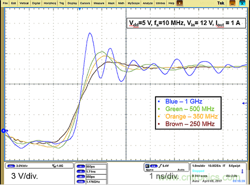 從[1]可清楚看出,可用的最高系統帶寬低于基于EPC8009的設計的振鈴頻率?,F在我們將觀察選擇不同的系統帶寬如何影響采用更高速的GaN晶體管(如EPC8009)和相對較慢的GaN晶體管(如EPC2045和EPC2022)的開關節點波形。