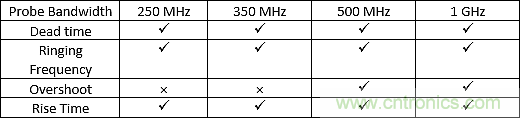 采用EPC8009的設計所測量到的振鈴頻率(fr1)為1.176GHz,它采用最高帶寬1GHz的探頭。圖2(頂部)中顯示的較低帶寬情況進一步降低了測量振鈴頻率的準確性。當考慮峰值電壓過沖時,同樣很明顯的是,較低帶寬測量值會低估各個開關器件的峰值電壓。對于與時序相關的死區時間的測量,系統帶寬也很重要。如圖2(頂部)所示,對于500MHz和1GHz帶寬,死區時間是可見的,雖然測量來并不是很精確。在較低帶寬下,死區時間幾乎不存在。表1顯示了采用最高速的EPC8009,系統帶寬對關鍵測量結果的影響。