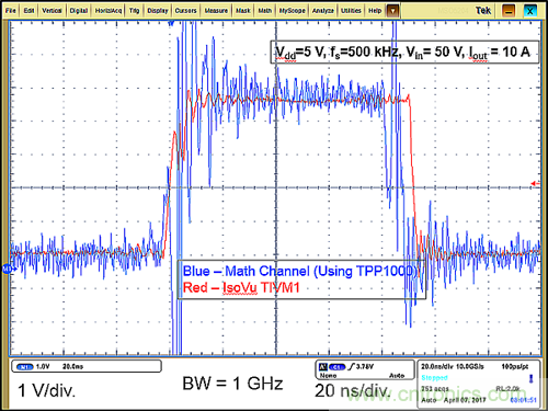 當電路以所示電壓和電流供電時,“嘈雜”環境中的高開關噪聲放大了測量之間的差異。由于其高CMRR,使用隔離探頭捕獲的波形更清晰[7]。