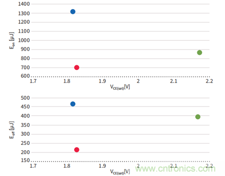 600/650V IGBT 飽和壓降(VCE(sat) )  vs開通損耗(Eon ) & 關斷損耗(Eoff)比較測試條件: TC = 150°C, IC = 15 A, Rg = 25, VGE = 15 V。