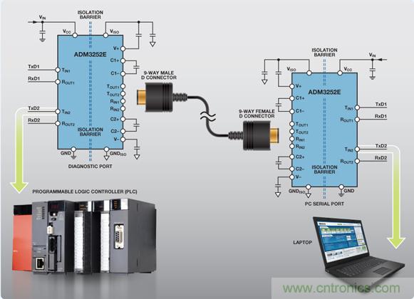 要提供隔離式 RS-232 通信接口,兩端的器件必須與所連的RS-232 電纜相互隔離。要隔離數據鏈路,則必須對數據信號線路和用于驅動該電纜的電源進行隔離。來自診斷端口上UART 的數據需要跨越隔離柵并傳輸至隔離總線側上的RS-232 收發器。本地 5 V/3.3 V 電源也需要跨越隔離柵來為隔離總線側上的 RS-232 收發器供電。工業 PC 端也同樣需要如此:數據和電源均需要跨越隔離柵(圖 3).通過將器件與 RS-232 電纜網絡隔離開來,診斷端口和工業 PC電路均受到保護,不受惡劣環境下可能耦合到 RS-232 電纜上的瞬變影響。隔離還可以中斷因診斷端口和工業 PC 端存在不同接地電位而可能出現的接地環路。RS-232 總線上可能出現的高共模電壓不能跨越隔離柵,從而保護隔離數據的用戶。
