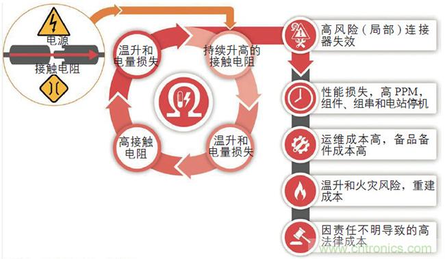 電站的盈利能力與選擇高質(zhì)量的部件息息相關(guān)。業(yè)主在光伏連接器上節(jié)省資金,并不是一種明智的做法。因?yàn)椋蛔⒅刭|(zhì)量,通常意味著后續(xù)的高損失和風(fēng)險(xiǎn),而這些本可避免。光伏連接器的低接觸電阻及長(zhǎng)期可靠性,能夠保障電站高效和安全運(yùn)行。而持續(xù)升高的接觸電阻會(huì)導(dǎo)致光伏項(xiàng)目的安全風(fēng)險(xiǎn)大幅提高,降低電站運(yùn)行效率。需要指出的是,各種不同的風(fēng)險(xiǎn)因素是密切相關(guān)的,如圖1 所示。