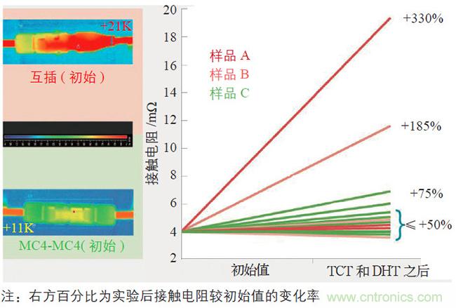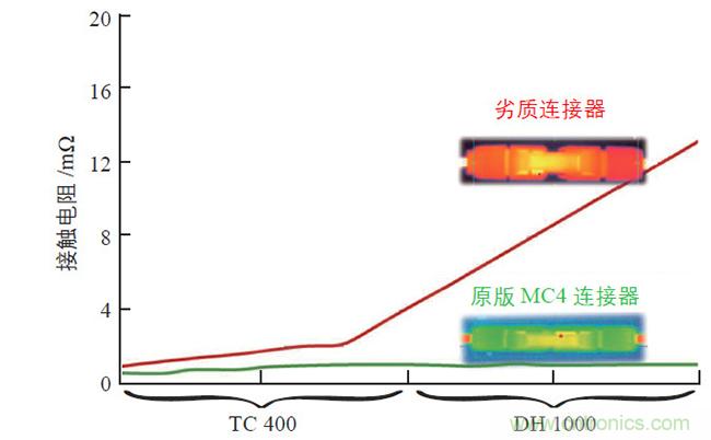 從光伏連接器的外觀和質(zhì)感可大致了解該產(chǎn)品的外形設(shè)計(jì)及絕緣材料的選擇。但是,評(píng)價(jià)光伏連接器好壞的核心指標(biāo)是公母連接器對(duì)插之后的接觸電阻。一個(gè)高質(zhì)量的連接器須具有很低的接觸電阻,并能夠長(zhǎng)期維持這種低接觸電阻狀態(tài)。根據(jù)光伏連接器最新國(guó)際標(biāo)準(zhǔn)IEC 62852,公母對(duì)插后的接觸電阻在TC200+DH1000 測(cè)試后,增量不能大于5 mΩ或者電阻終值小于初始值的150%。而這僅是最低要求,不同廠商連接器的接觸電阻值取決于制造商的技術(shù)水平。對(duì)于如何評(píng)判接觸電阻,TC400(2×TC200)和DH1000 實(shí)驗(yàn)提供了一個(gè)解讀方向。圖2 為實(shí)驗(yàn)比較后的結(jié)果,由圖2 可知,高質(zhì)量的光伏連接器的接觸電阻非常穩(wěn)定,這主要得益于其所使用的電連接技術(shù)。因此,客戶在選擇光伏連接器時(shí),須對(duì)其所使用的核心技術(shù)進(jìn)行全面的了解。