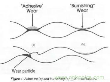 在(b)處較弱的界面可能在原始界面處或附近斷裂,很少發(fā)生磨損。(a)處的磨損過(guò)程通常稱為粘著磨損,(b)處的磨損過(guò)程稱為拋光磨損。如果在放大鏡下觀察連接器咬合過(guò)程中產(chǎn)生的磨損軌跡,在30~50倍放大時(shí),粘著磨損軌跡將顯示出磨損顆粒的跡象,并顯得有些粗糙,而拋光磨損軌跡將顯得光滑和光亮。