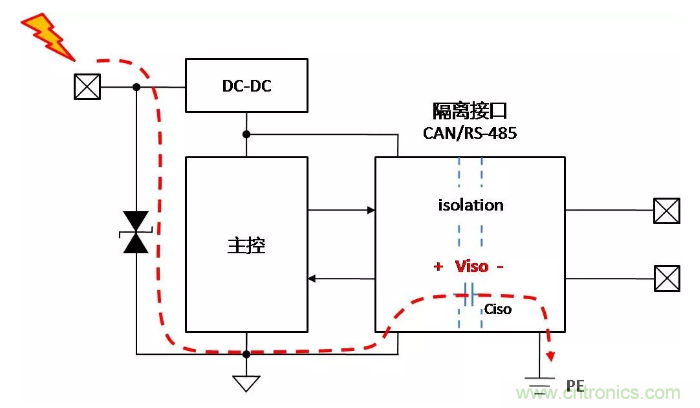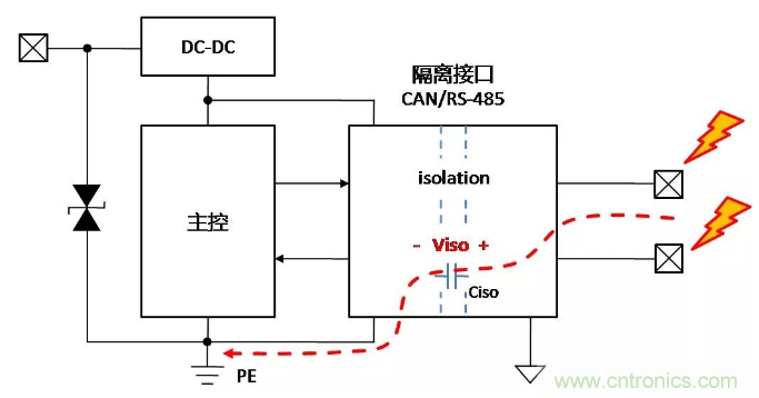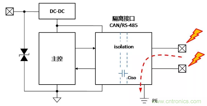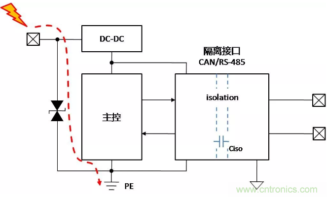 假設(shè)控制側(cè)均做了足夠的保護(hù)措施,當(dāng)控制側(cè)接口受到靜電放電時(shí),能量通過(guò)控制側(cè)保護(hù)器泄放至PE,對(duì)隔離通信接口基本無(wú)影響,如下面圖2。