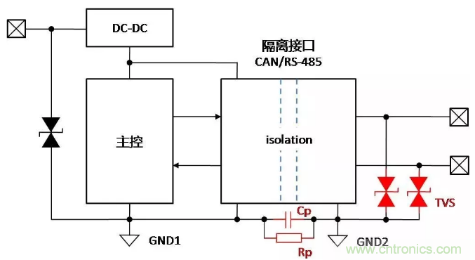 總線增加隔離固然可以保證總線穩(wěn)定可靠地通信,但是帶隔離通信接口的設(shè)備,在復(fù)雜的環(huán)境或安裝狀態(tài)下,接口會(huì)表現(xiàn)出完全不同的ESD特性,了解ESD對(duì)接口的影響機(jī)理,才能有針對(duì)性地增加保護(hù)器件,提升隔離接口的ESD能力。下面以帶有隔離CAN或RS-485通信接口為例,對(duì)常見(jiàn)的設(shè)備狀態(tài)下,ESD的作用機(jī)理進(jìn)行分析,并提出相應(yīng)的改善措施。