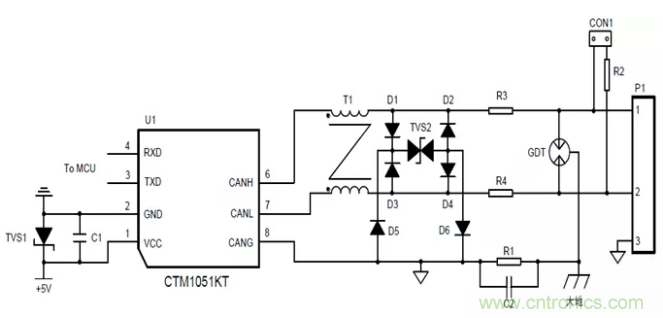 前面只是對(duì)ESD的作用機(jī)理進(jìn)行了分析,但隨著工業(yè)產(chǎn)品對(duì)通信接口的EMC等級(jí)要求越來(lái)越高。許多應(yīng)用要求滿足IEC61000-4-2靜電放電4級(jí),IEC61000-4-5浪涌抗擾4級(jí)要求。一般的收發(fā)器ESD、浪涌的防護(hù)等級(jí)均比較低,如CTM1051M隔離CAN收發(fā)器的隔離耐壓為2500VDC,裸機(jī)情況下,ESD、浪涌等級(jí)均較低。所以有必要增加外圍電路,提高通信端口的EMC等級(jí)。