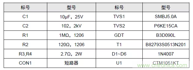 以CAN總線為例,上圖為完善的外圍推薦電路。其中GDT置于最前端,提供一級(jí)防護(hù),當(dāng)雷擊、浪涌產(chǎn)生時(shí),GDT瞬間達(dá)到低阻狀態(tài),為瞬時(shí)大電流提供泄放通道,將CAN_H、CAN_L間電壓鉗制在二十幾伏范圍內(nèi)。實(shí)際取值可根據(jù)防護(hù)等級(jí)及器件成本綜合考慮進(jìn)行調(diào)整,R3 與 R4 建議選用 PTC,D1~D6 建議選用快恢復(fù)二極管,參數(shù)表如下。