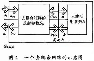 為了使正交模式的輻射效率最大,文獻和文獻詳細論述了等效耦合參數(shù)的方法。對于一個雙天線系統(tǒng),等效去耦合網(wǎng)絡如圖4所示,其中S是天線的反射參數(shù),SD是去耦合網(wǎng)絡的反射參數(shù),文獻指出加入了去耦合系統(tǒng)的S參數(shù)可以表示為:
