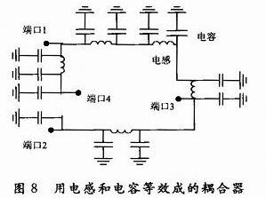 由于第二部分設計的天線傳輸線阻抗是50 Ω,所以1/4傳輸線的阻抗是70.7 Ω,將710 MHz代入,則可以求得L=15.8 nH,C=3.17 pF。這樣,就可以設計出180°的混合耦合器如圖8所示。將耦合器的3,4端口通過通孔連接天線,1,2端口接饋電網(wǎng)絡,就可構(gòu)成一個雙天線的去耦合系統(tǒng)。