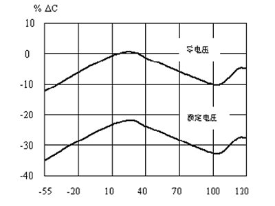 從圖中可以看到,COG電容器的容量幾乎隨溫度沒有變化,X7R電容器的容量在額定工作溫度范圍變化12%以下,Y5V電容器的容量在額定工作溫度范圍內(nèi)變化70%以上。這些特性是必須注意的,否則會出現(xiàn)濾波器在高溫或低溫時性能變化而導(dǎo)致設(shè)備產(chǎn)生電磁兼容問題。