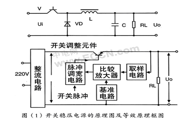 圖(1)畫出了開關穩壓電源的原理圖及等效原理框圖,它是由全波整流器,開關管Vi,激勵信號,續流二極管VD,儲能電感和濾波電容C組成。實際上,開關穩壓電源的核心部分是一個直流變壓器。這里我們對直流變換器和逆變器作如下解釋。逆變器,它是把直流轉變為交流的裝置。逆變器通常被廣泛地應用在采用電平或電池組成的備用電源中。直流變換器,它是把直流轉換成交流,然后又把交流轉換成直流的裝置。這種裝置被廣泛地應用在開關穩壓電源中。采用直流變換器可以把一種直流供電電壓變換成極性、數值各不同的多種直流供電電壓。