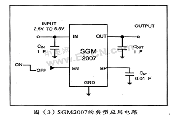目前大多IC設計產商生產的低壓差線性穩壓器(LDO)典型封裝都是SOT23-5和SOT23-3,如圣邦微電子的SGM2007,SGM2013。如圖(3)為SGM2007的典型應用電路圖。
