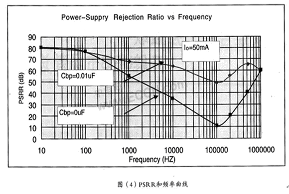 電源抑制比PSRR(Power supply ripple rejectionratio)是反應LDO輸出對輸入紋波抑制能力的一個交流參數,一般輸出和輸入的頻率是一樣的,PSRR的值越大說明LDO的紋波能力越強,也就是說輸入對輸出的影響很小。盡管LDO的電源抑制比很強,但都是在一定頻率內的抑制很強,一般的在50KHz到200kHz的電源抑制比還是很差的如圖(4)為SGM2007的PSRR和頻率曲線,而這段頻率正是大多數開關電源的工作頻率,如果LDO的負載和輸入輸出電容匹配不好,很容易引起LDO振蕩。而造成整個LDO供電系統的不穩定。