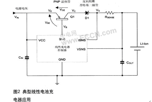 線性充電器設計簡單,體積較小,并且沒有"開關模式轉換器"常有的噪音,這些優點使得線性充電器特別適用于小功率、低噪音應用。線性充電器使用外部調節元件,以將電池電壓由輸入電源降至電池電壓,因此功率損耗較大。圖2顯示具備外部調節元件與反向阻斷肖特基二極管的典型線性充電器應用。
